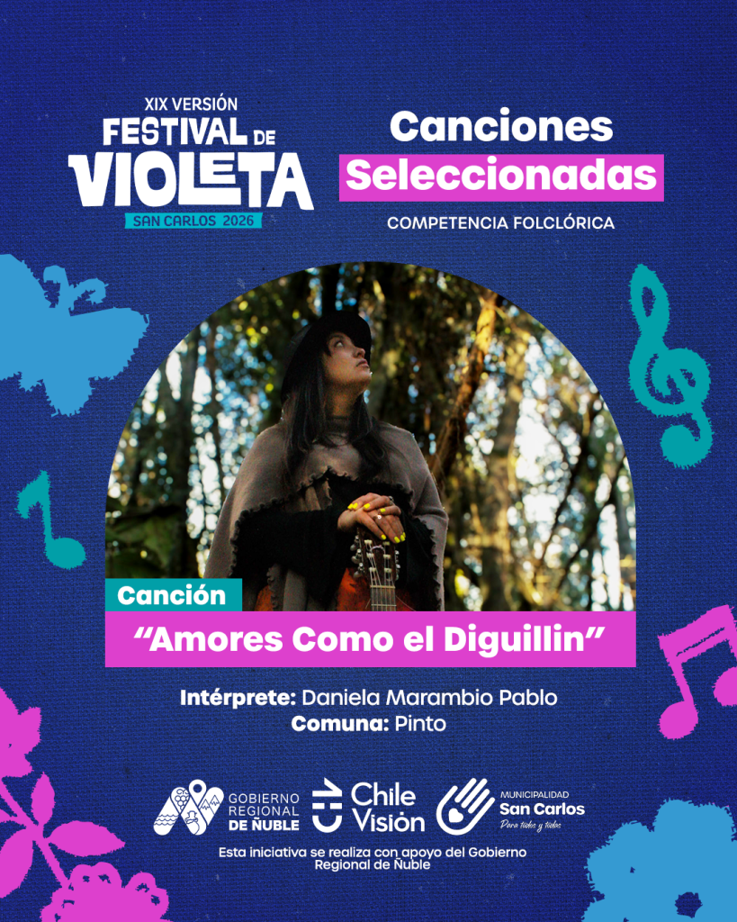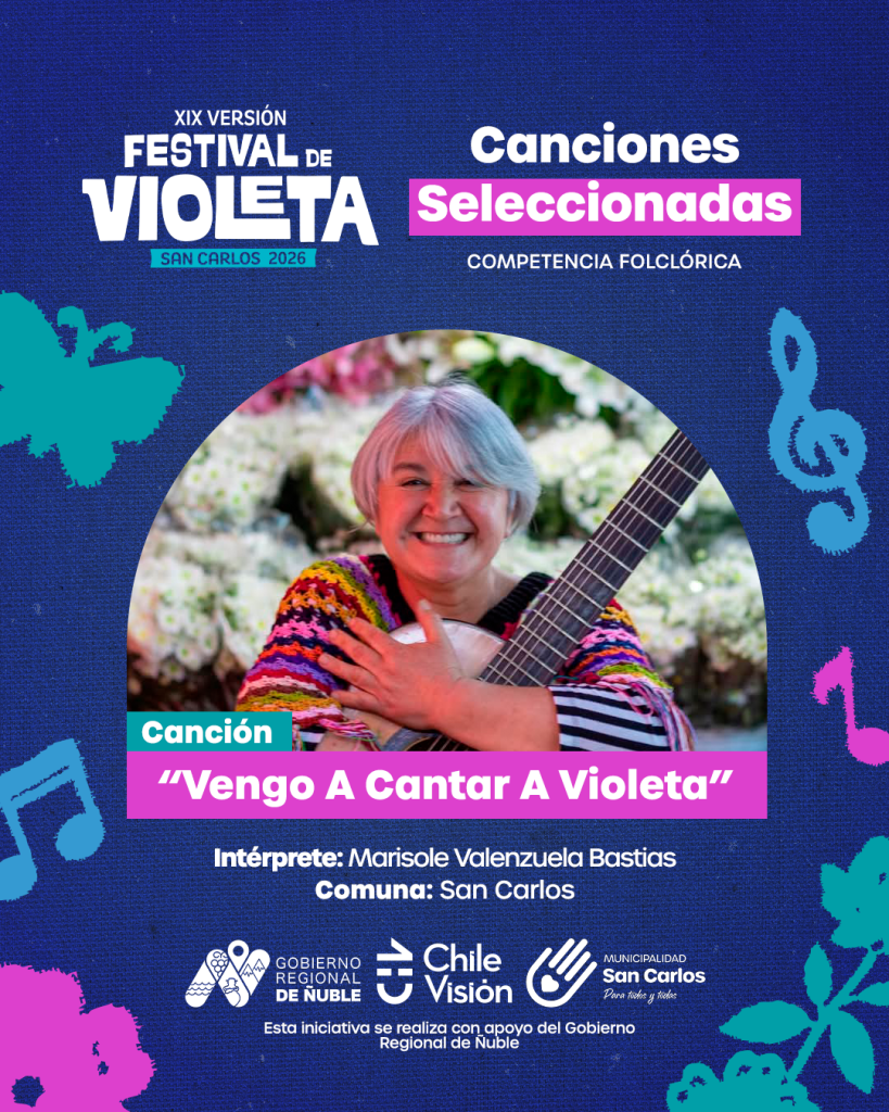 Por San Carlos competirá la reconocida artista y folclorista regional Marisole Valenzuela Bastías, referente cultural de la comuna, con la canción “Vengo a cantarte Violeta”, de su propia autoría y composición. Su propuesta destaca por el vínculo con la tradición local y por un trabajo artístico que dialoga directamente con el legado de Violeta Parra y la identidad cultural del territorio.