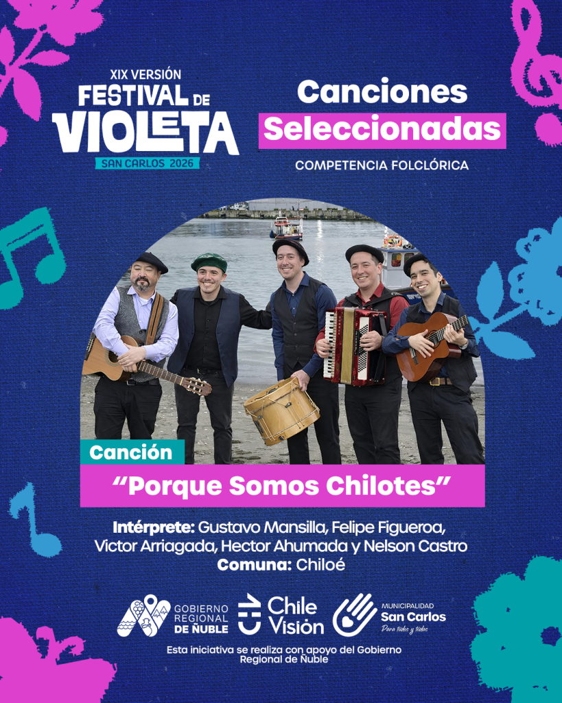 En representación de Chiloé, el grupo Los Cancioneros llegará a la competencia con la canción “Porque somos chilotes”, de autoría y composición de Nelson Castro Pinto. La agrupación, con base en Castro, Chiloé, y Puerto Montt, está conformada por cinco músicos especializados en la interpretación del folclore chileno, con participación en diversos festivales de música folclórica e inédita a nivel nacional, destacando por su trabajo de rescate y proyección de la identidad chilota.